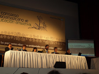 No me resisto a añadir aquí algunos apuntes de la ponencia de la educadora peruana, Eloísa Trellez, recuperó la pluralidad de voces, culturas y paisajes de Iberoamérica y las reunió en una gran polifonía, es decir, “una música variante de la pedagogía ambiental”. Una pieza constituída por siete pasos: El paso del colibrí, donde compara a los educadores ambientales con pequeños colibríes que, gota tras gota cargadas en su pico, buscan apagar un gran incendio con la certeza de “haber hecho lo que está al alcance de sus posibilidades”. El Paso del Tiempo, al afirmar que “con la velocidad nos hemos detenido”, o mejor dicho, que tras la ilusión de inmediatez otorgada por las nuevas tecnologías, “el tiempo nos está comprimiendo sin darnos cuenta olvidando el tiempo de la naturaleza”. El Paso del Desgajamiento, donde la pensadora trasandina nos habla de la necesidad de retornar al “Todo”, porque, en palabras del Maestro Jorge Uribe “nos hemos desgajado del tronco bajo la premisa de una supuesta independencia” sin recordar de dónde venimos en realidad. El Paso de la Evolución y Ayuda Mutua, donde la ayuda mutua es condición para la evolución y el avance de la especie, retomando a Charles Darwin y sus 200 años de la Teoría de la Evolución. El Paso de la E-moción (entrar en movimiento), con hincapié en la creatividad y en el arte como formas de despertar la sensibilidad del mundo. El Paso del Buen Humor y la Ternura, ligados a la salud y la convivencia con el otro y por último, el Paso de la Escucha del amor, como una forma de escuchar al otro y construir el conocimiento a través de la acción participativa.